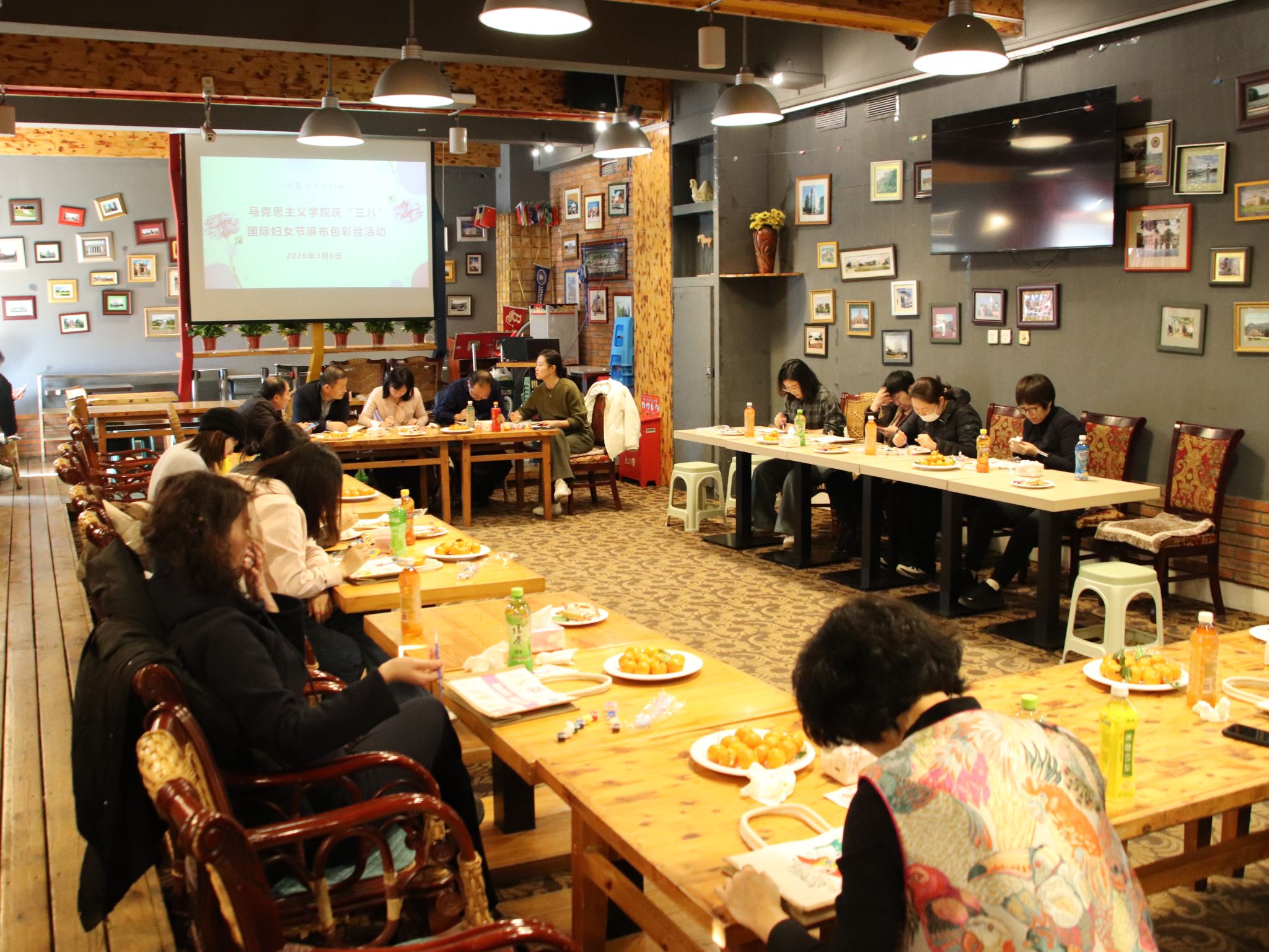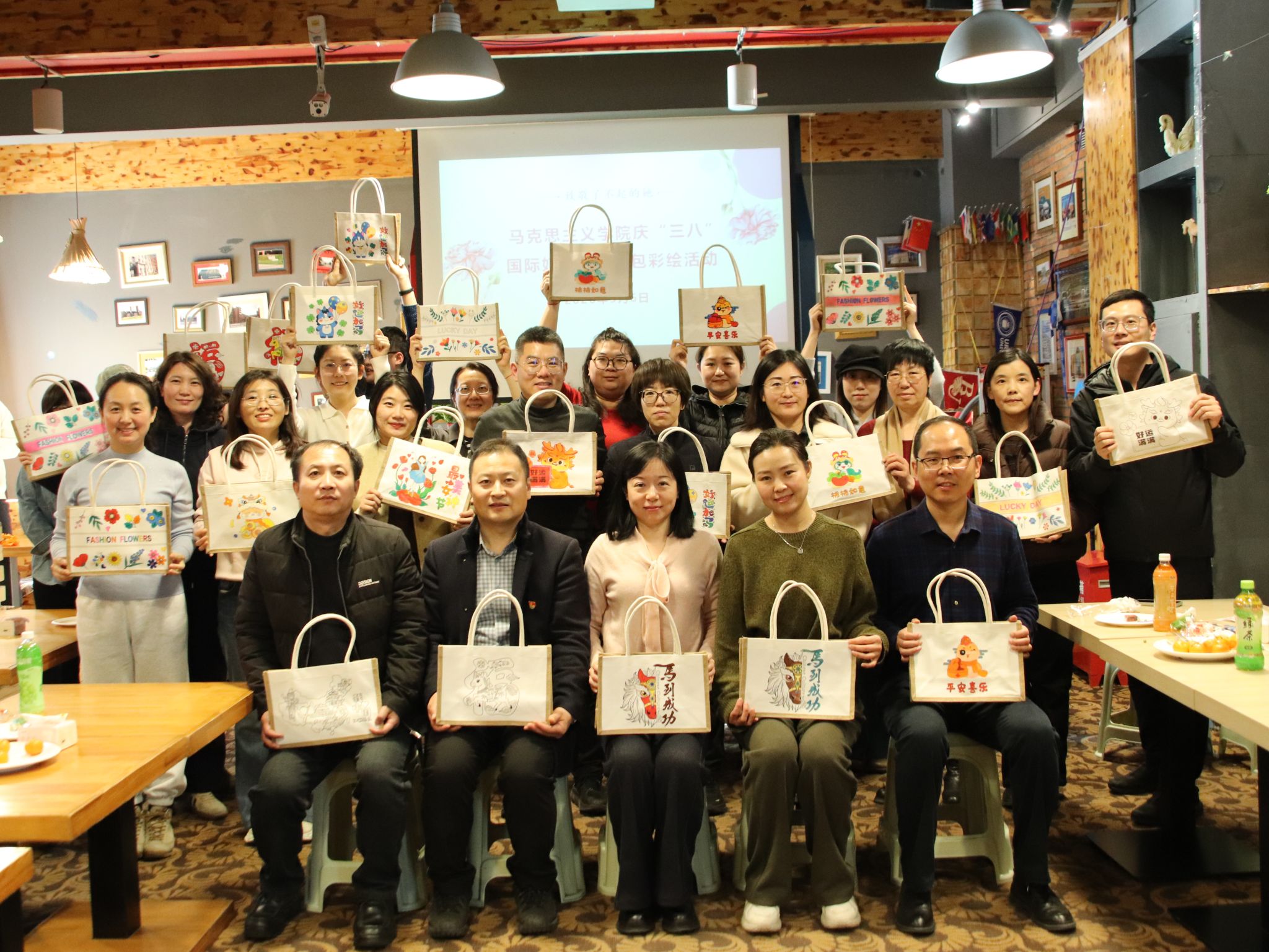 为纪念第116个“三八”国际妇女节,丰富女教职工的精神文化生活,3月6日,马克思主义学院在世界名校沙龙举办了“巧手绘芳华,奋进新时代”纪念“三八”国际妇女节麻布包彩绘活动。学院领导班子与全体女教职工欢聚一堂,共度美好节日。学院党委副书记宋琳奇主持活动。