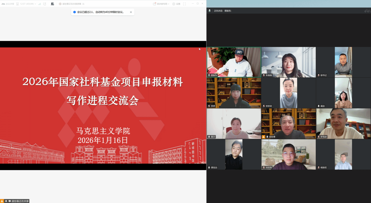 为扎实推进国家社科基金项目申报工作,进一步提升申报质量与立项成功率,1月16日晚,马克思主义学院在线上召开2026年度国家社科基金申报工作推进会。学院党委书记柳建军、院长阚迪及申报教师参加会议。会议由副院长顾世春主持。