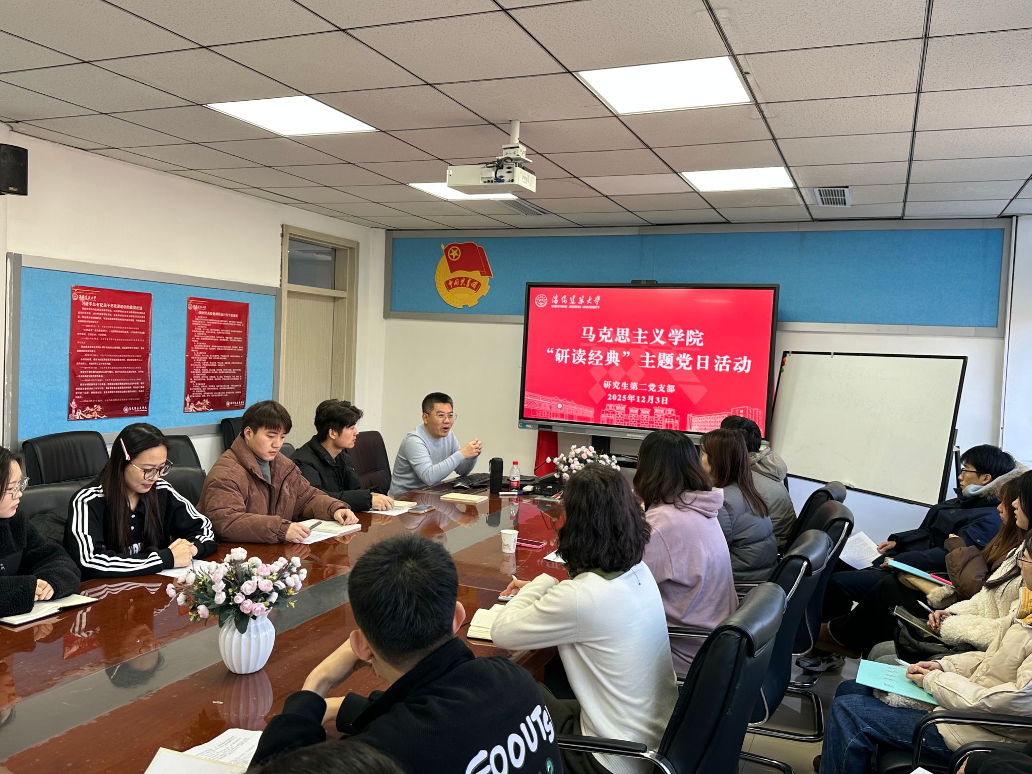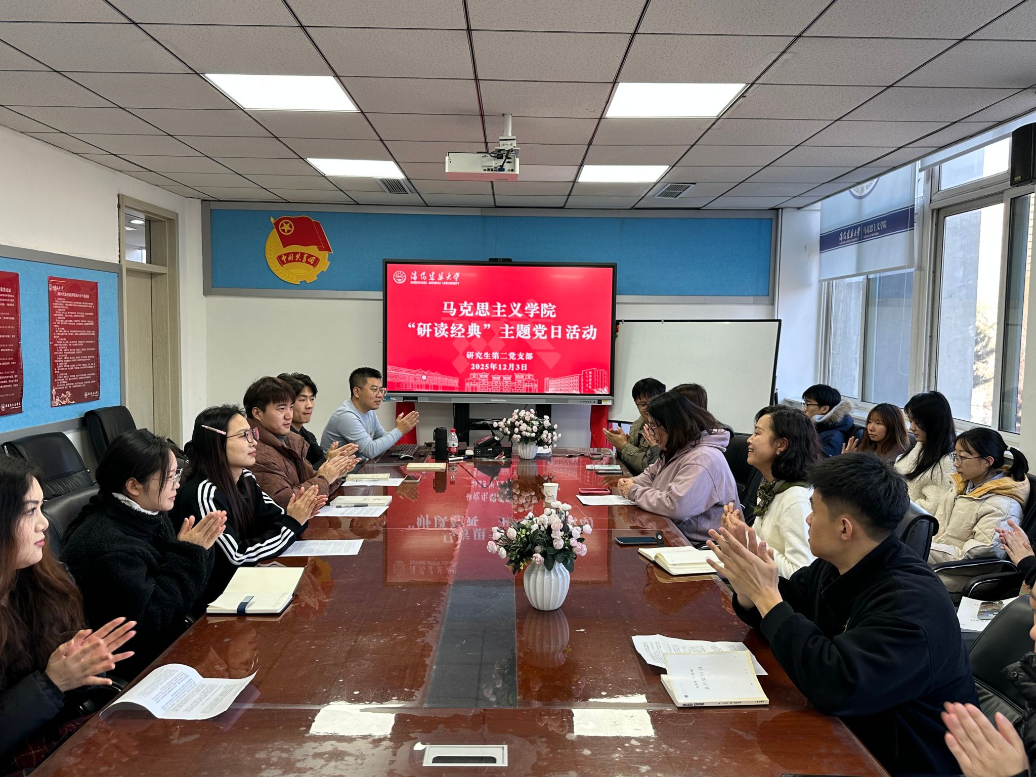 为深入推进“一支部一品牌”建设,以“党建+专业”模式筑牢研究生党员的理想信念根基,打造特色党建品牌,12月3日,马克思主义学院研究生第二党支部举办了“研读经典”主题党日活动。学院党委副书记、副院长、纪委书记宋琳奇,辽宁省高校思政课中青年骨干教师、哲学社会科学青年拔尖人才、学院教工第一党支部书记刘世昱出席活动,研究生第二党支部书记张宇、研究生党员、入党积极分子参加了活动。